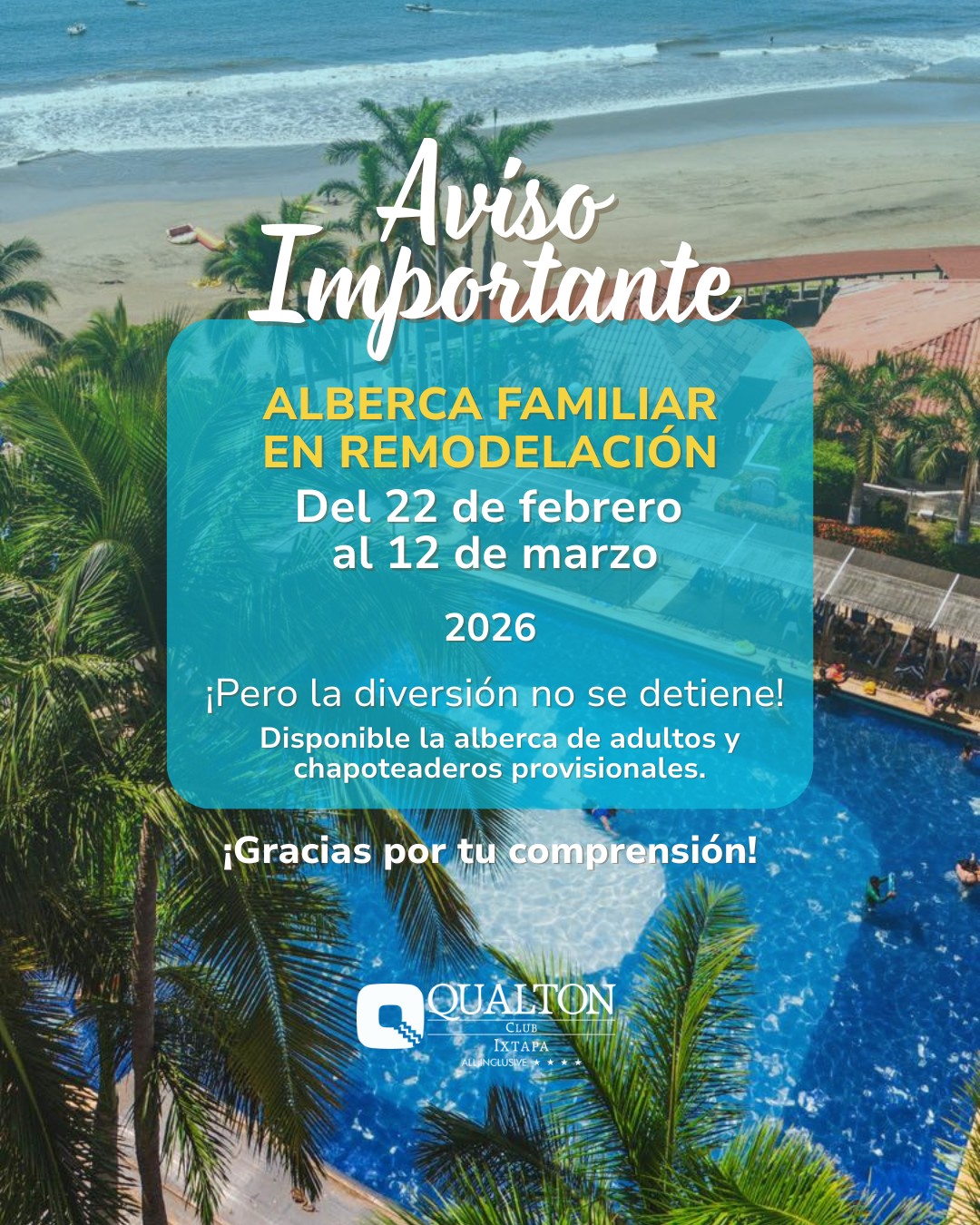 Ixtapa Zihuatanejo es un maravilloso destino de espectaculares playas y extensas áreas de vegetación tropical, ideal para descanso o practicar diferentes deportes como: pesca, buceo, snorkel, surf , golf, ciclismo, atletismo entre otros. Excelente lugar para hacer del contacto con la naturaleza una experiencia inolvidable. Qualton Club Ixtapa es un hotel familiar en plan todo incluido, está privilegiadamente ubicado frente a la isla de Ixtapa, uno de los más destacados atractivos del destino, su playa se caracteriza por un muy relajado oleaje.